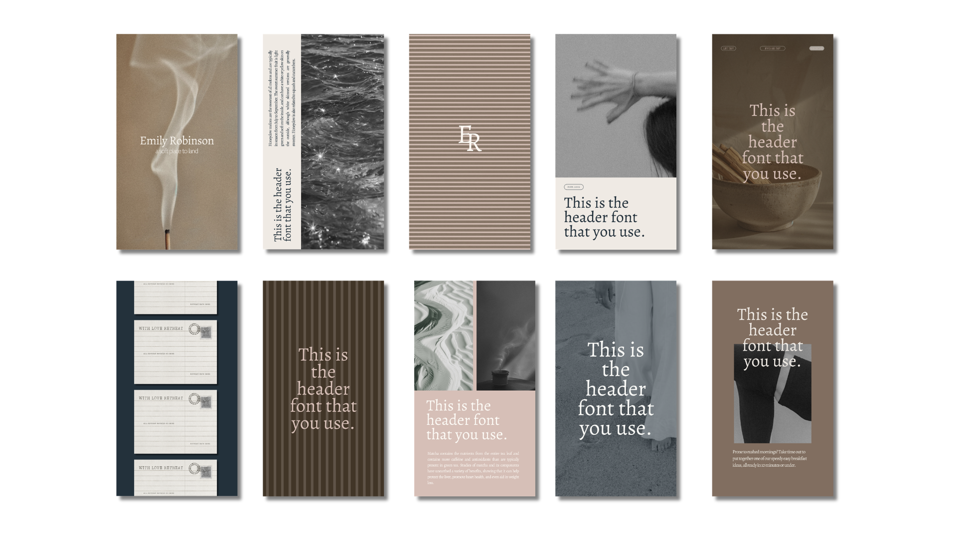 A sturdy yet soft brand identity for a mindfulness and retreat leader. Deep browns and navies paired with warm blush and cream to evoke reflection and presence.